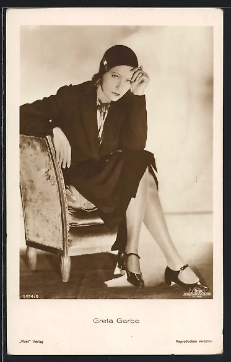 AK Schauspielerin Greta Garbo sitzend in Denkerpose