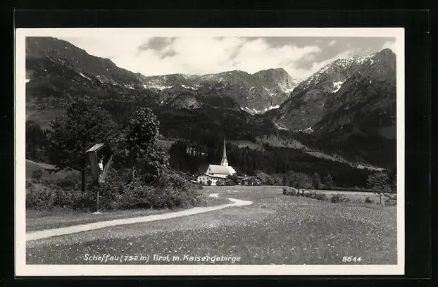 AK Scheffau, Blick zur Kirche unter dem Kaisergebirge