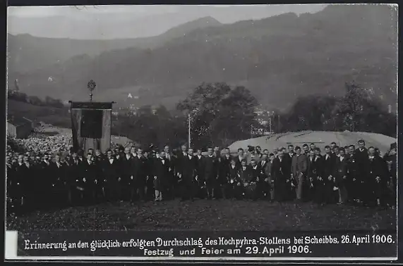 AK Scheibbs, Durchschlag des Hochpyhra-Stollens 1906, Festzug und Feier