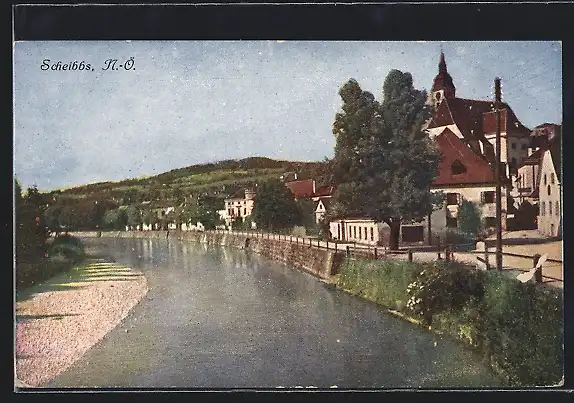 AK Scheibbs /N.-Ö., Uferpartie mit Kirche
