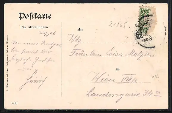 alte Ansichtskarte, gelaufen, Briefmarke entfernt, rückseitig Oberflächenschaden, guter Zustand