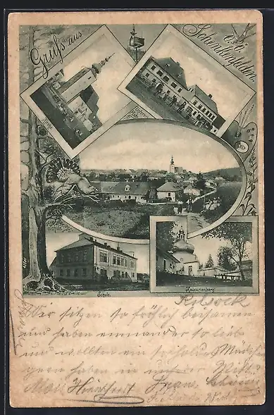 AK Schenkenfelden, Kirche, Kalvarienberg und Ortsansicht