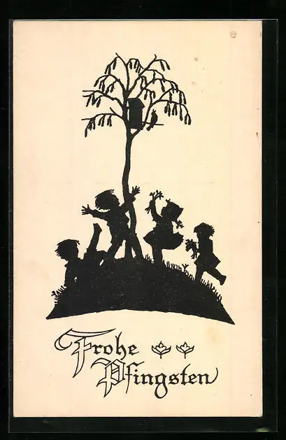 AK Scherenschnitt, Kinder am Baum mit Vogelhaus, Pfingsgruss