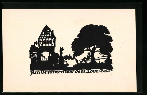AK Scherenschnitt, Mann sitzt unterm Baum, Am Brunnen vor dem Tore