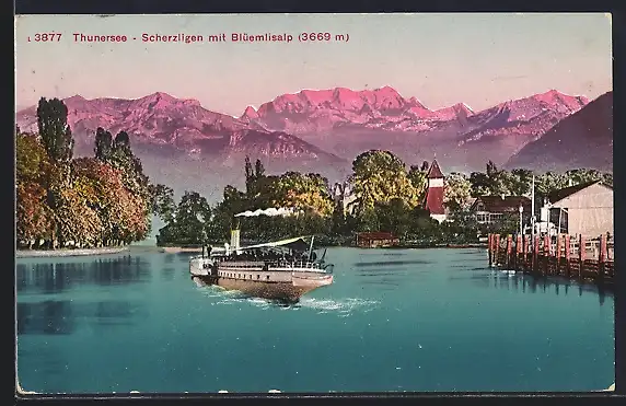 AK Scherzligen /Thunersee, Ortsansicht mit Blüemlisalp