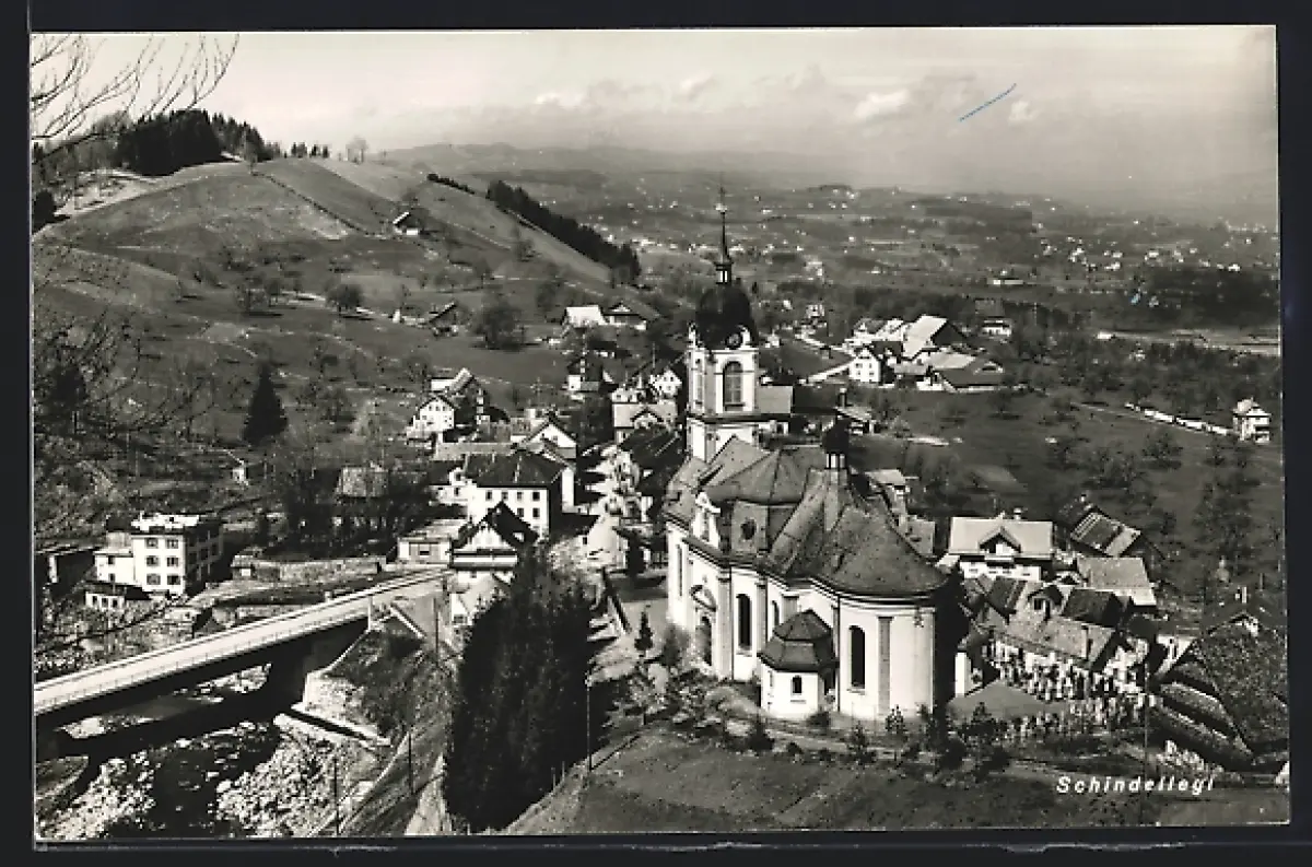 AK Schindellegi, Gesamtansicht mit Kirche und Hinterland