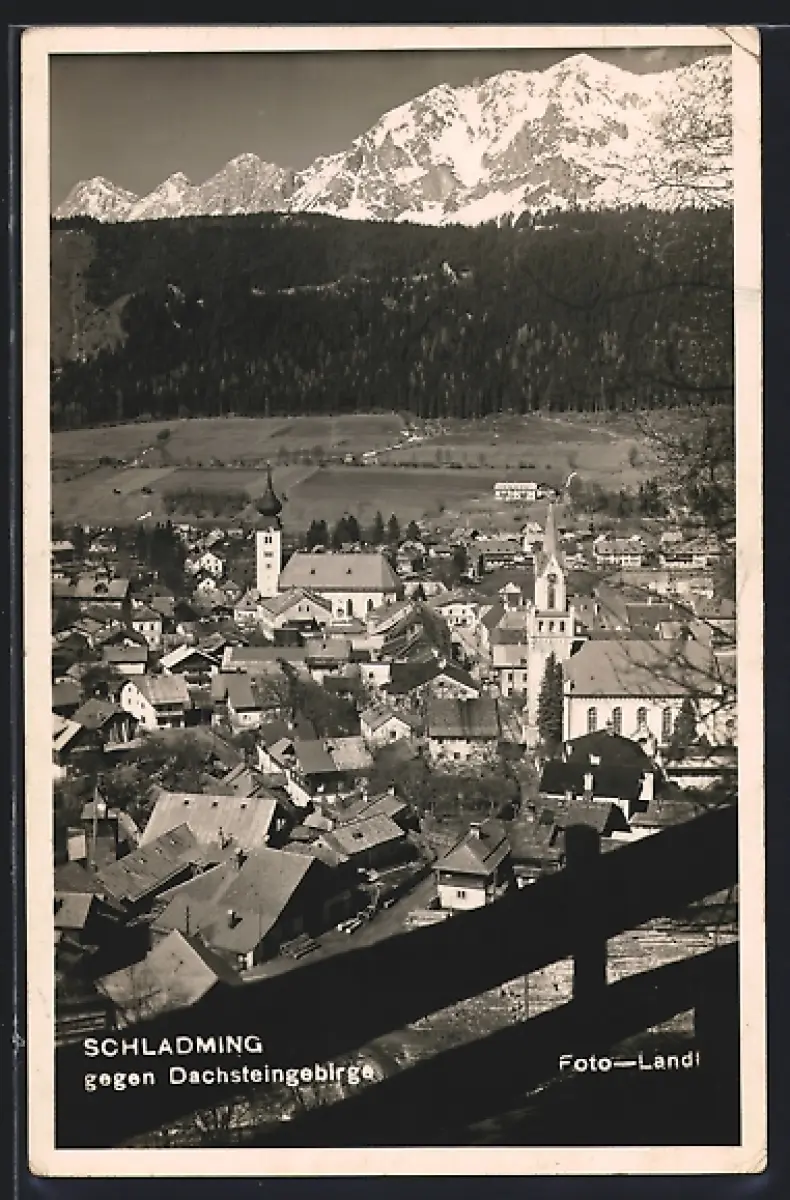 AK Schladming, Ortsansicht gegen Dachsteingebirge