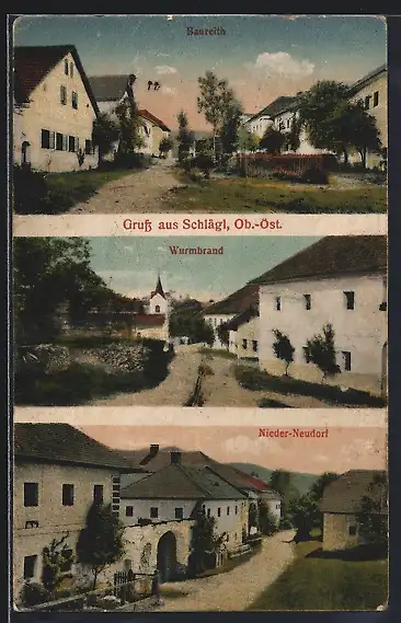 AK Schlägl /Ob.-Öst., Strassenpartie Baureith, Ortspartie Wurmbrand m. Kirche, Strassenpartie Nieder-Neudorf