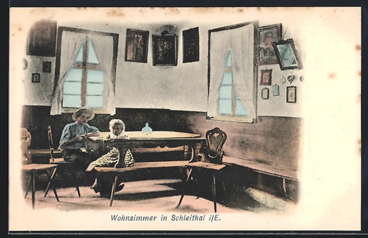 AK Schleithal i. E., Frau und Kind im Wohnsimmer