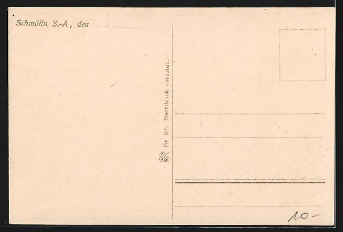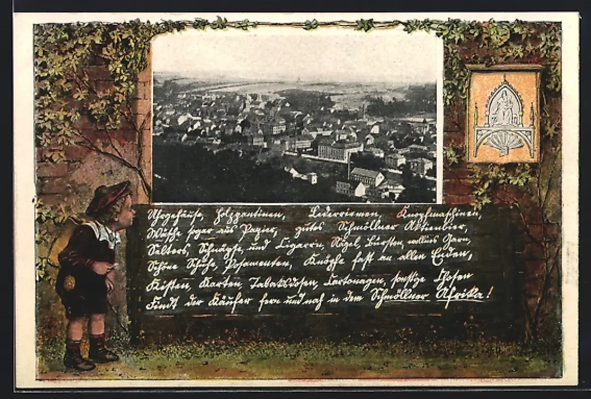 AK Schmölln S.-A., Ortsansicht aus der Vogelschau, Junge an Tafel