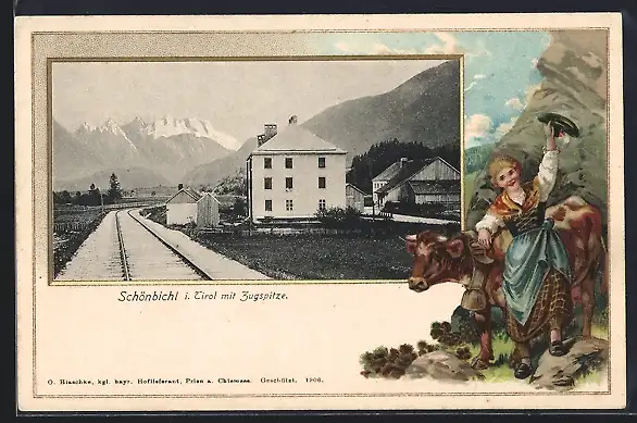 AK Schönbichl i. Tirol, Ortsansicht mit Zugspitze, Mädel in Tracht