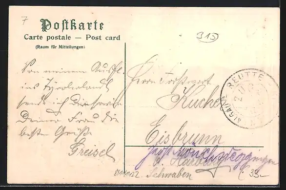 alte Ansichtskarte, gelaufen, Briefmarke entfernt, guter Zustand