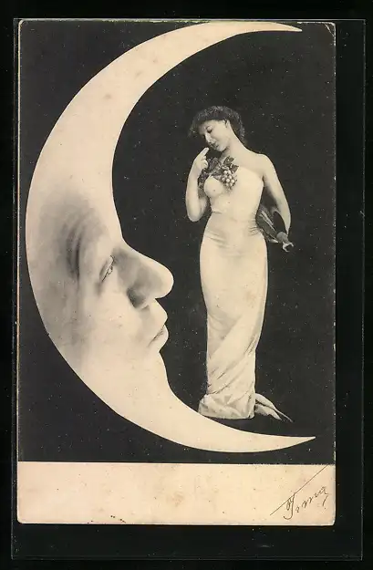 AK Schöne Frau steht auf der Mondsichel, ein Gesicht schaut sie an