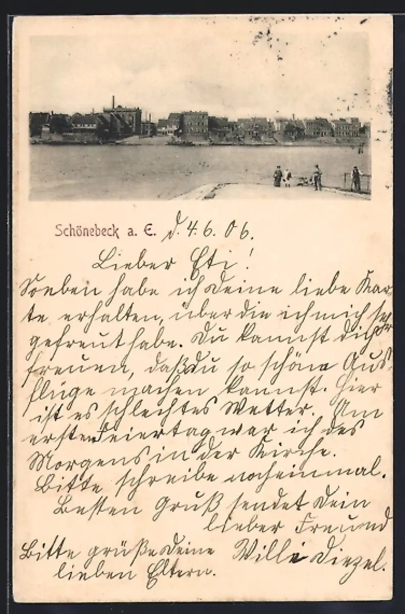 AK Schönebeck a. E., Flusspartie mit Menschen am Ufer