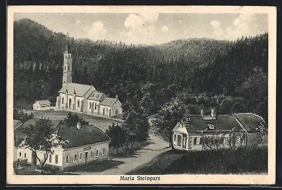 AK Schollach, Maria Steinparz, Ortsansicht mit der Kirche aus der Vogelschau