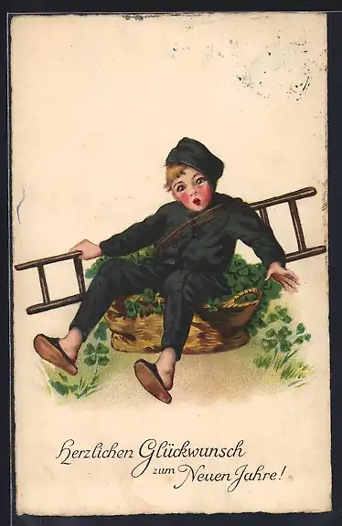 AK Schornsteinfeger in einem Korb voller Glücksklee, Neujahrsgruss