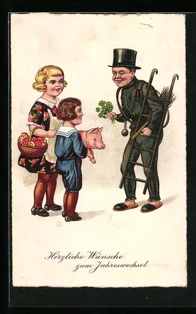 AK Schornsteinfeger mit Kindern und Kleeblättern, Neujahrsgruss