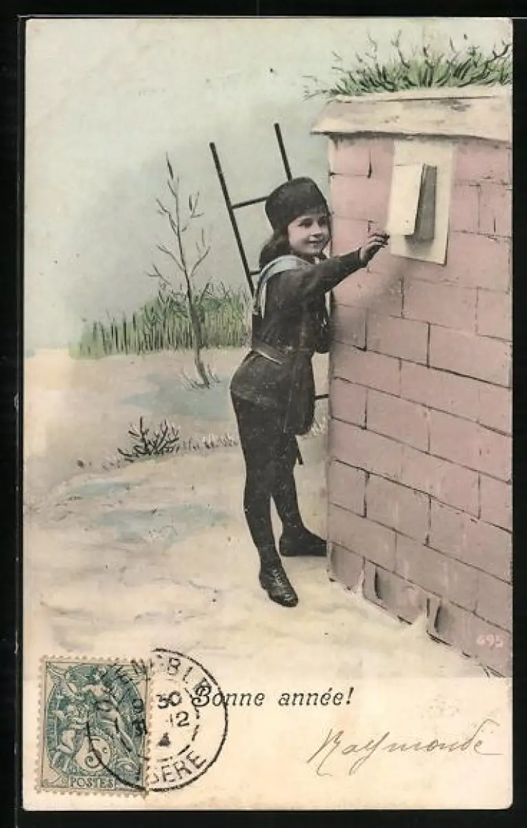 AK Schornsteinfeger mit Leiter reisst ein Kalenderbatt ab, Bonne année
