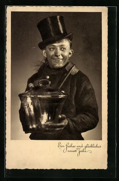 AK Schornsteinfeger mit einer Schale in den Händen, Neujahr