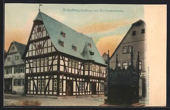 AK Schotten, Rathaus mit Kirchenbrunnen