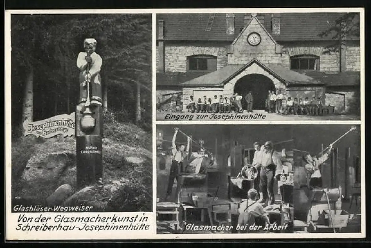 AK Schreiberhau, Eingang zur Josephinenhütte, Glasmacher bei der Arbeit, Glasbläser-Wegweiser