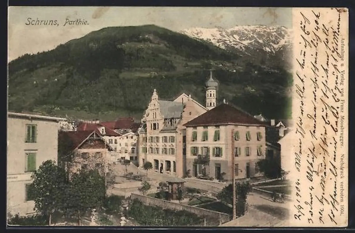 AK Schruns, Parthie im Ort mit Bergpanorama
