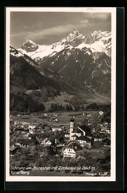 AK Schruns im Montafon, Teilansicht mit Kirche und Zimbaspitze
