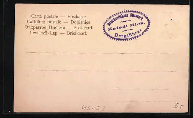 Personenbezogene Daten auf der Rückseite der Karte wurden durch blauen Textmarker unkenntlich gemacht. Die blauen Stellen sind auf die Vorderseite durchgeweicht und wirken sich negativ auf das Postkartenfoto aus