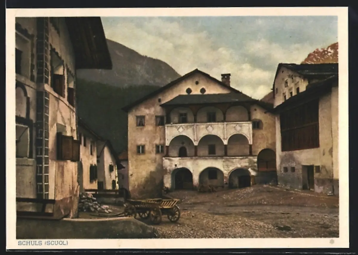 AK Schuls, Ortspartie mit Bergen und einem Karren