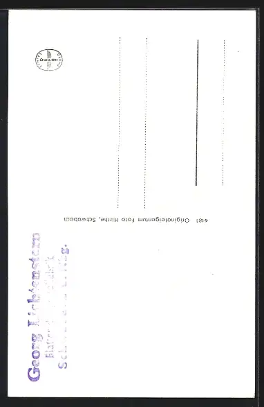 Personenbezogene Daten auf der Rückseite der Karte wurden durch blauen Textmarker unkenntlich gemacht. Die blauen Stellen sind auf die Vorderseite durchgeweicht und wirken sich negativ auf das Postkartenfoto aus