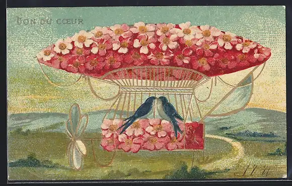 AK Schwalben in einem Ballon aus Blumen, Neujahrsgruss