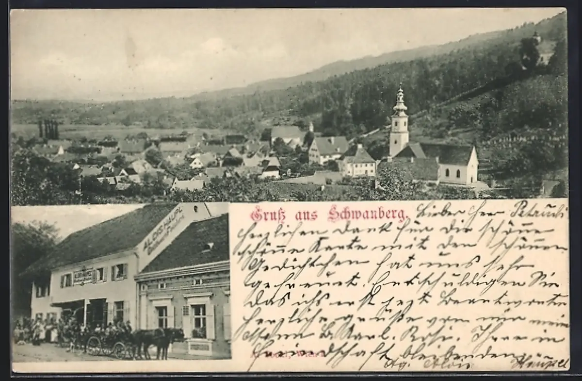 AK Schwanberg, Ortsansicht und Gasthaus Haupl