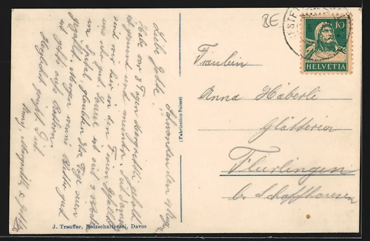 Personenbezogene Daten auf der Rückseite der Karte wurden durch blauen Textmarker unkenntlich gemacht. Die blauen Stellen sind auf die Vorderseite durchgeweicht und wirken sich negativ auf das Postkartenfoto aus