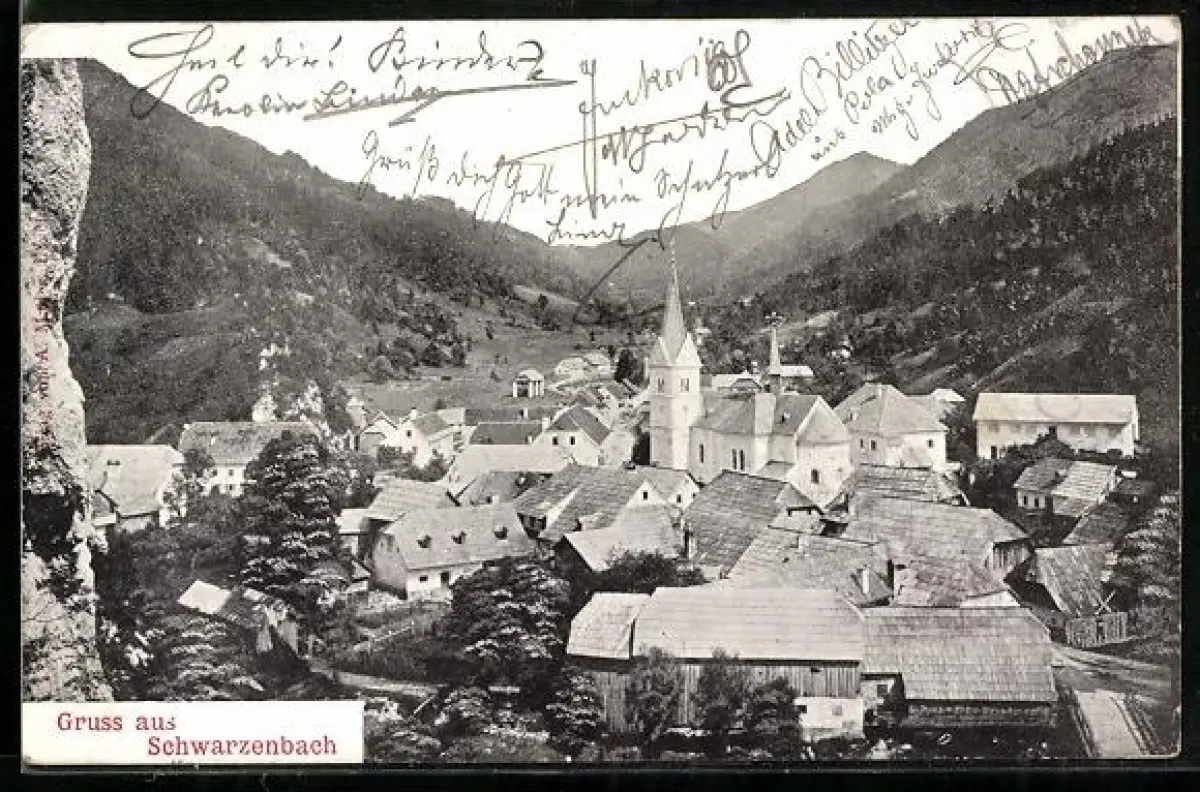 AK Schwarzenbach, Totalansicht mit Kirche aus der Vogelschau