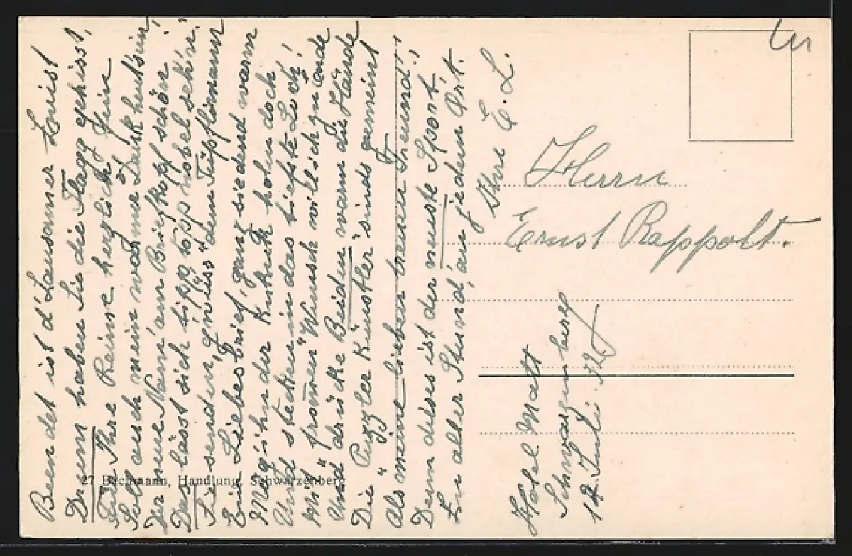 Personenbezogene Daten auf der Rückseite der Karte wurden durch blauen Textmarker unkenntlich gemacht. Die blauen Stellen sind auf die Vorderseite durchgeweicht und wirken sich negativ auf das Postkartenfoto aus