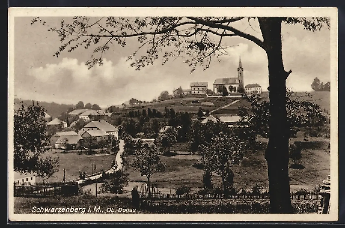 AK Schwarzenberg i. M., Ortsansicht mit der Kirche auf dem Hügel