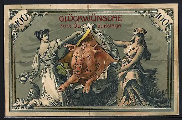 AK Schwein mit Kleeblatt durch zerrissenen Geldschein, Neujahrsgruss