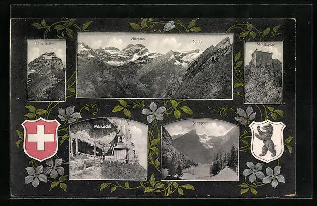 AK Schwende, Wildkirchli Seealpsee, Säntisspitze, Wappen