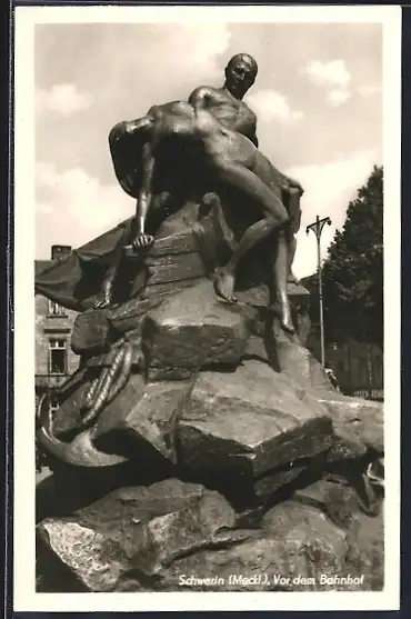 AK Schwerin /Meckl., Statue vor dem Bahnhof