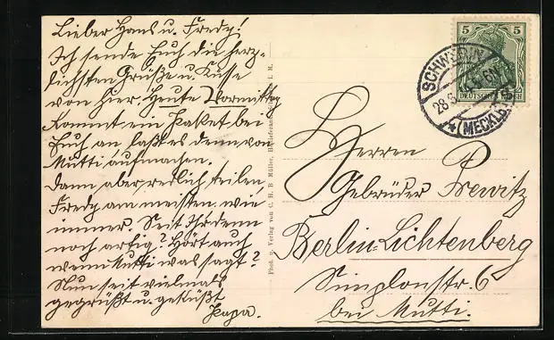 Personenbezogene Daten auf der Rückseite der Karte wurden durch blauen Textmarker unkenntlich gemacht. Die blauen Stellen sind auf die Vorderseite durchgeweicht und wirken sich negativ auf das Postkartenfoto aus