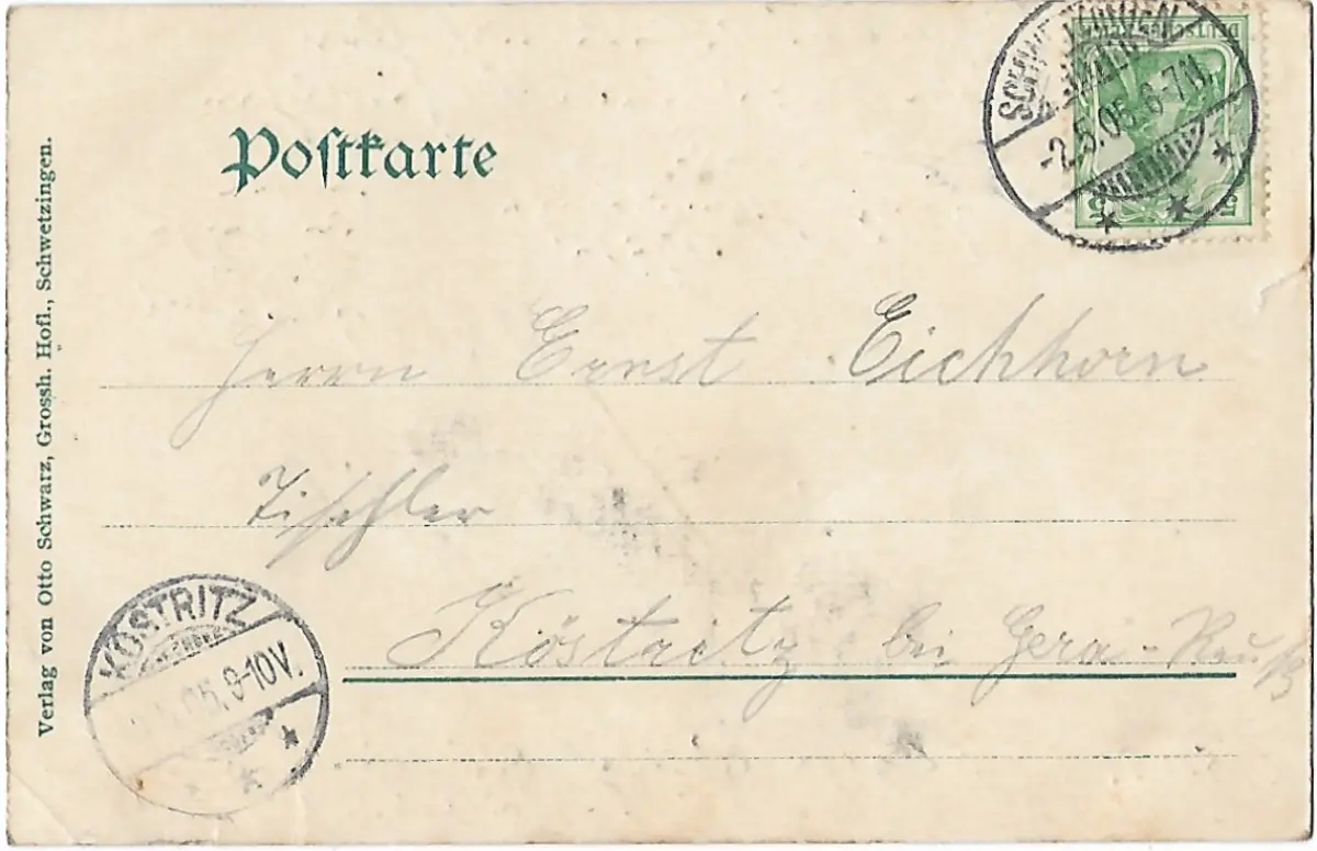 Schwetzingen: Verlag Otto Schwarz, ca. 1905. Karte, 9 x 14 cm