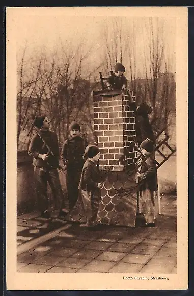 AK Sechs kleine Schornsteinfeger auf dem Dach