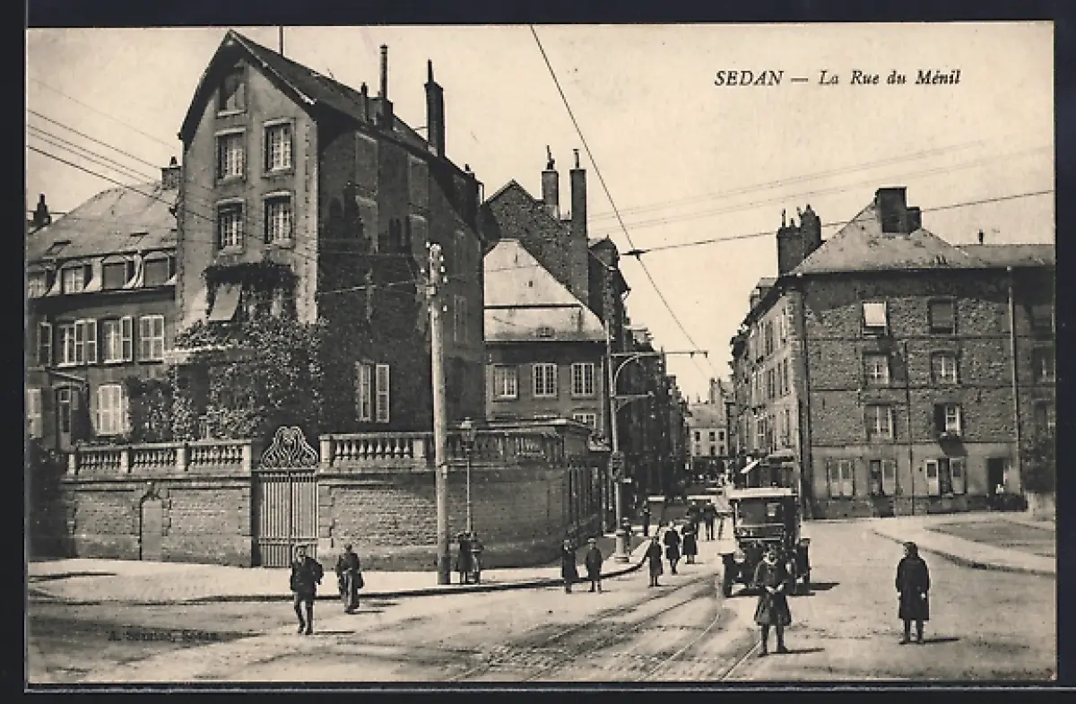 AK Sedan, La Rue du Ménil avec passants et tramway