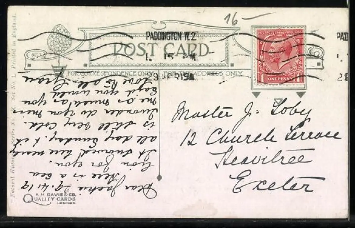 Personenbezogene Daten auf der Rückseite der Karte wurden durch blauen Textmarker unkenntlich gemacht. Die blauen Stellen sind auf die Vorderseite durchgeweicht und wirken sich negativ auf das Postkartenfoto aus