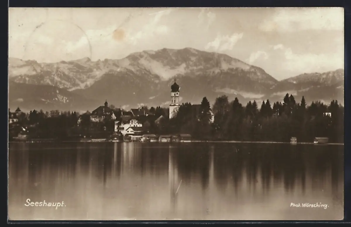 AK Seeshaupt, Ortsansicht mit Kirche und Alpenpanorama
