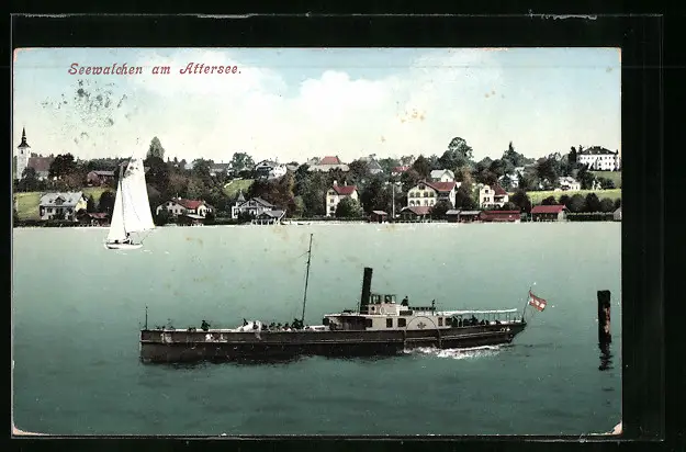 AK Seewalchen am Attersee, Totalansicht mit Salondampfer