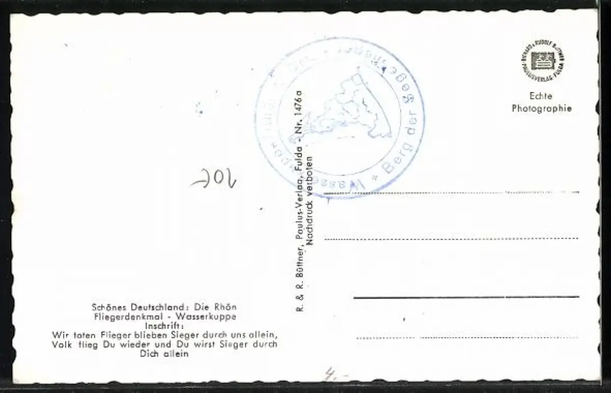 Personenbezogene Daten auf der Rückseite der Karte wurden durch blauen Textmarker unkenntlich gemacht. Die blauen Stellen sind auf die Vorderseite durchgeweicht und wirken sich negativ auf das Postkartenfoto aus