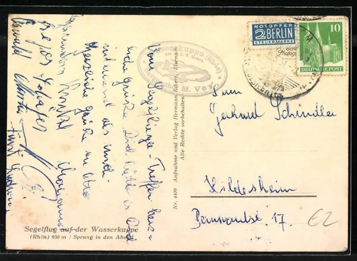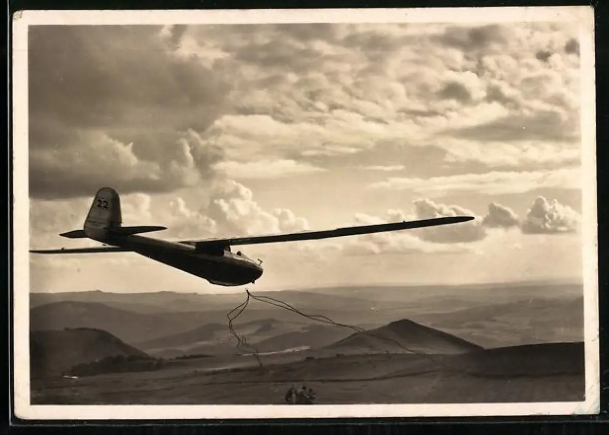 AK Segelflugzeug an der Wasserkuppe klinkt das Zugseil aus
