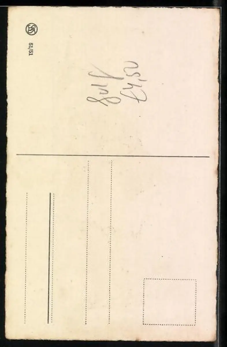 Personenbezogene Daten auf der Rückseite der Karte wurden durch blauen Textmarker unkenntlich gemacht. Die blauen Stellen sind auf die Vorderseite durchgeweicht und wirken sich negativ auf das Postkartenfoto aus