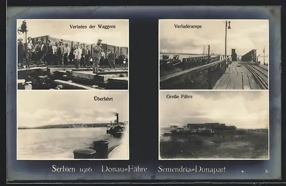 AK Semendria, Donaufähre, Verladen der Waggons am Hafen